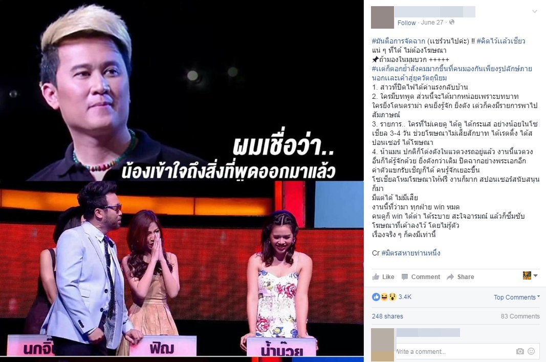 “#มันคือการจัดฉาก (เเชร์วนไปค่ะ) #คิดไว้เเล้วเชียว แน่ ๆ ที่ได้ ไม่ต้องโฆษณา ถ้ามองในมุมบวก +++++ #เเต่ก็ตอกย้ำสังคมมากขึ้นที่คนมองกันเพียงรูปลักษ์ภายนอกเเละเค้าสู่ยุควัตถุนิยม 1.สาวที่ปิดไฟได้ค่าแรงกลับบ้าน 2.ใครมีบทพูด ส่วนนี้จะได้มากหน่อยเพราะบทบาท ใครยิ่งโดนดราม่า คนยิ่งรู้จัก ยิ่งดัง เด่วก็คงมีรายการพาไปสัมภาษณ์ 3. รายการ.. ใครที่ไม่เคยดู ได้ดู ได้กระแส อย่างน้อยในโซเชียล 3-4 วัน ช่วยโฆษณาไม่เสียสักบาท ได้เรตติ้ง ได้สปอนเซอร์ ได้โฆษณา 4. น้าแมน ปกติก็โด่งดังในแวดวงรถอยู่แล้ว งานนี้แวดวงอื่นก็ได้รู้จักด้วย ยิ่งดังกว่าเดิม ปิดฉากอย่างพระเอกอีก ค่าตัวแขกรับเชิญก็ได้ คนรู้จักเยอะขึ้น โซเชียลโหมโฆษณาให้ฟรี งานก็มาก สปอนเซอร์สนับสนุนก็มา มีแต่ได้ ไม่มีเสีย งานนี้ที่ว่ามา ทุกฝ่าย win หมด คนดูก็ win ได้ด่า ได้ระบาย สะใจอารมณ์ แล้วก็ซึมซับโฆษณาที่เค้าลงไว้ โดยไม่รู้ตัว เรื่องจริง ๆ ก็คงมีเท่านี้”