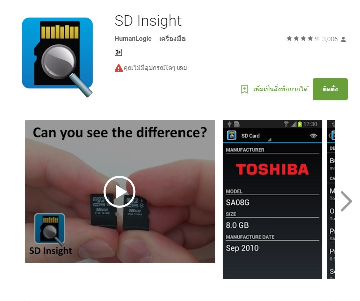 หากเราได้สังเกตุแล้วว่าไม่ค่อยเห็นอะไรแตกต่างมากนัก เพราะไม่รู้จะไปเปรียบเทียบกับ SD Card ของใคร ก็สามารถเสียบเข้ากับมือถือแล้ว ดาวน์โหลดแอพ SD Insight ฟรี จาก Google Play Store แล้วตรวจสอบโดยสมาร์ทโฟนได้เช่นเดียวกันครับ